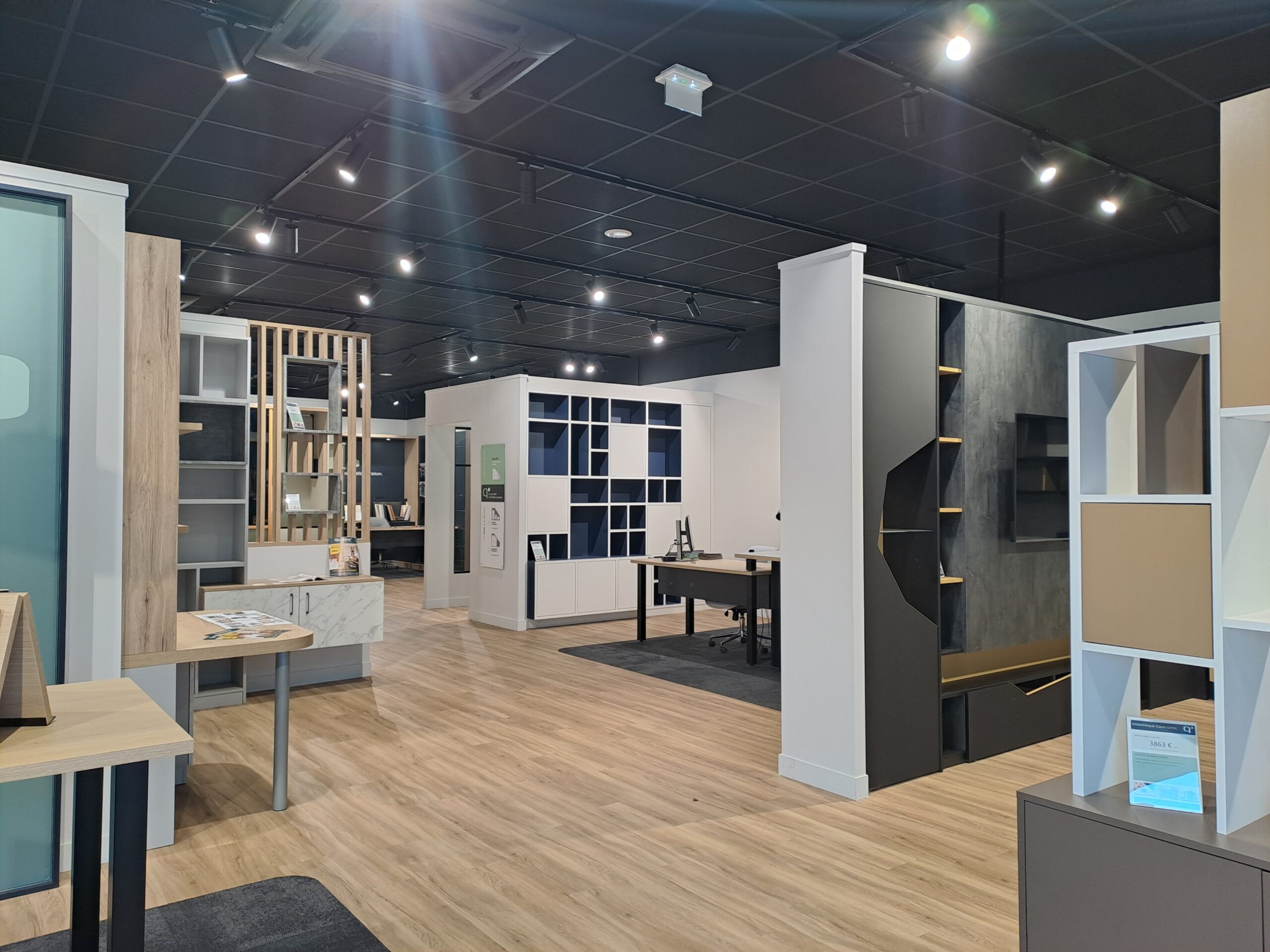 MOBILER D’EXPOSITION de marque QUADRO : meuble chambre, meuble vasque, meuble salle de bain, bibliothèque pont, meuble télévision, meuble buanderie, meuble photocopieur, cuisine aménagée avec eletroménager, meuble cave à vin, meuble canapé avec lit relevable, meuble entrée, dressing avec portes coulissantes, hotte BOSCH, 3 meubles bureau concept bleu marine+ fauteuil + Bureau + tablette tableau blanc, table haute bois, porte coulissante suspendue